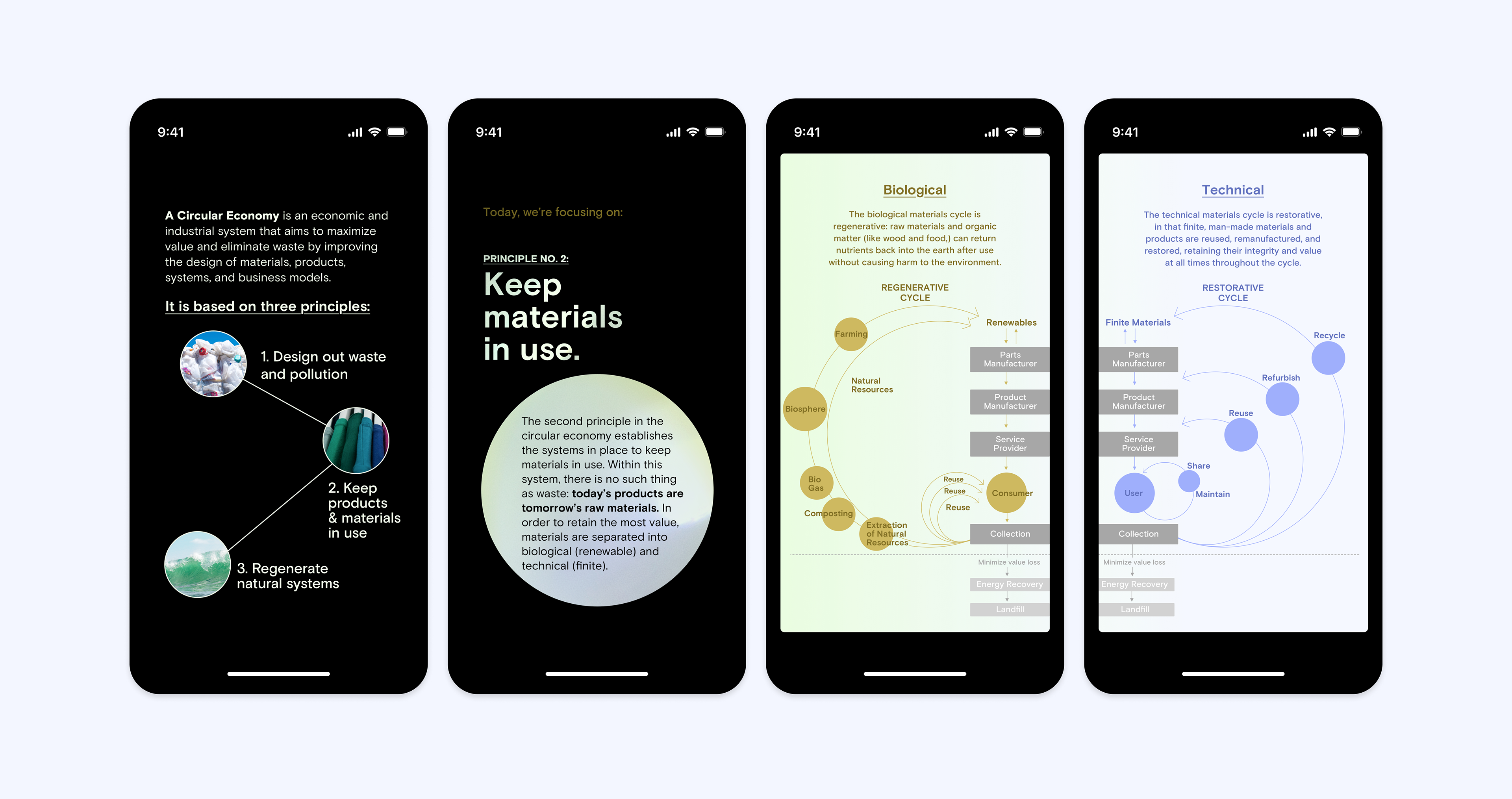 As part of our social media strategy for the studio, we invested our time researching ways we as designers can support a more sustainable future. Inspired by our time consulting for Kimberly-Clark Professional, we dug into the Ellen McArthur Foundation's principles of a Circular Economy. This research led to a four part series on our instagram stories, as well as in-feed posts communicating our systems-focused values surrounding design and the environment.